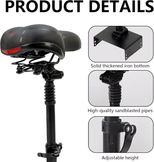 • Altura ajustable: asiento plegable para scooter, sillín para scooter eléctrico, asiento de montaje ajustable con función de elevación. Altura ajustable y plegable para adaptarse a una variedad de posiciones de conducción, el asiento ajustable en altura se adapta a todas las alturas. Altura regulable 49-67 cm para adaptarse a diferentes personas. Pliegue fácilmente el asiento para un manejo cómodo y para ahorrar espacio cuando no esté en uso