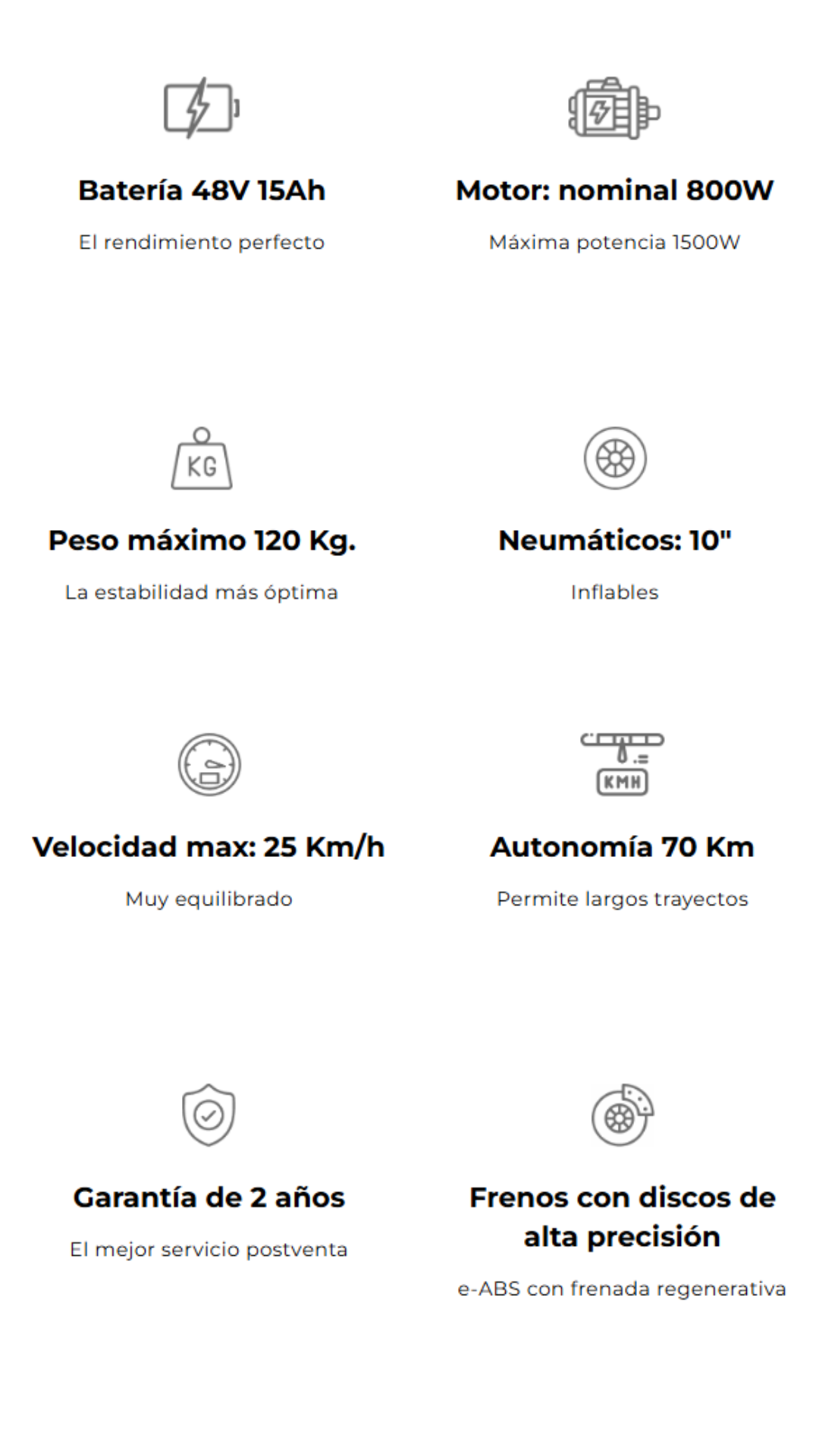 - Autonomía extendida: Batería de 48 V y 15 Ah para hasta 70 km de recorrido. Movilidad sin interrupciones para viajes largos.